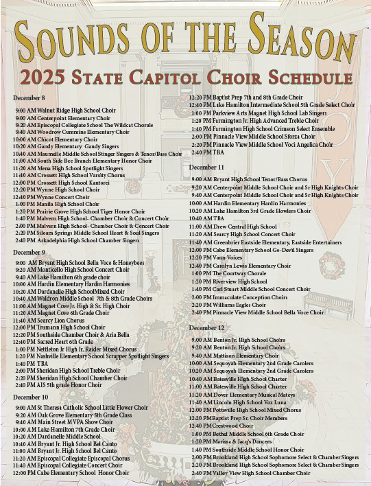 The Arkadelphia High School Choir performed at the Arkansas State Capitol as part of the annual Sounds of the Season celebration. The event featured student choirs from across the state and showcased the talent and hard work of young musicians in a festive holiday setting. We were proud to see AHS students represent our school and community on a statewide stage. |