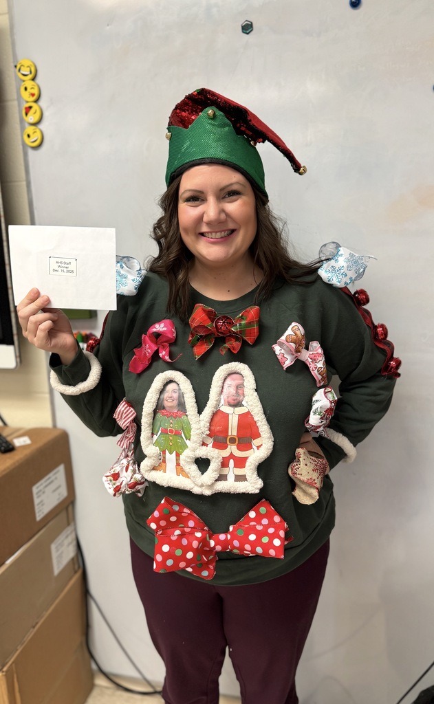 Arkadelphia High School showed off some serious holiday spirit during the festive sweater contest. Staff winner Heather McDaniel stole the show with a creative sweater featuring familiar faces—Coach Smith as Santa and Ms. Hunley as an elf—while student winner Keaton brought the holiday style to take top honors. Congratulations to our winners and everyone who joined in the fun, including the English Department on Plaid Day! |