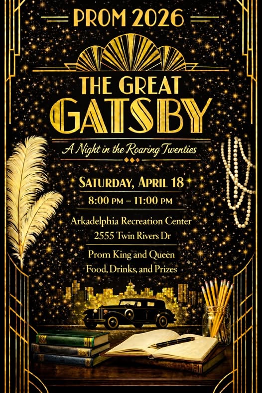 Prom 2026 will be themed “The Great Gatsby: A Night in the Roaring Twenties” and will take place on Saturday, April 18, from 8:00–11:00 PM at the Arkadelphia Recreation Center. Tickets are available online for all juniors and seniors, and juniors or seniors may invite a sophomore guest. The evening will include games, prizes, refreshments, and the crowning of Prom King and Queen. Ticket prices are $25 in February, $30 in March, and $35 in April, and donations to the prom fund are welcomed to help make the event even more special. Students are encouraged to purchase tickets early and prepare for a memorable night of celebration.