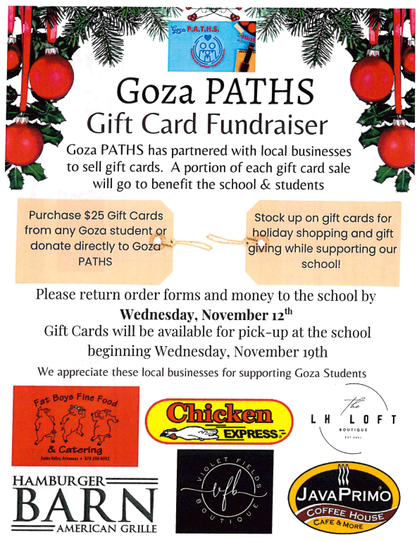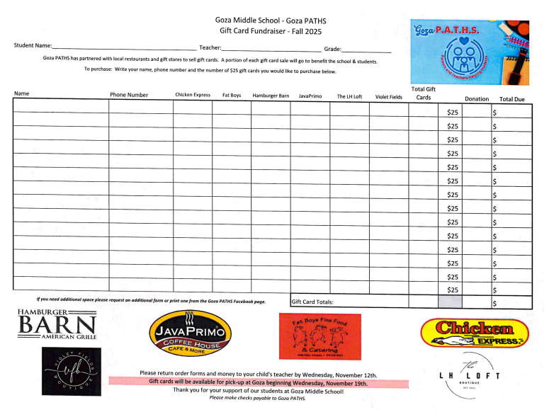 Goza PATHS annual gift card fundraiser is here! If you did not get a form at Parent-Teacher Conferences, they are coming home today. If you would like a printable copy, click HERE .