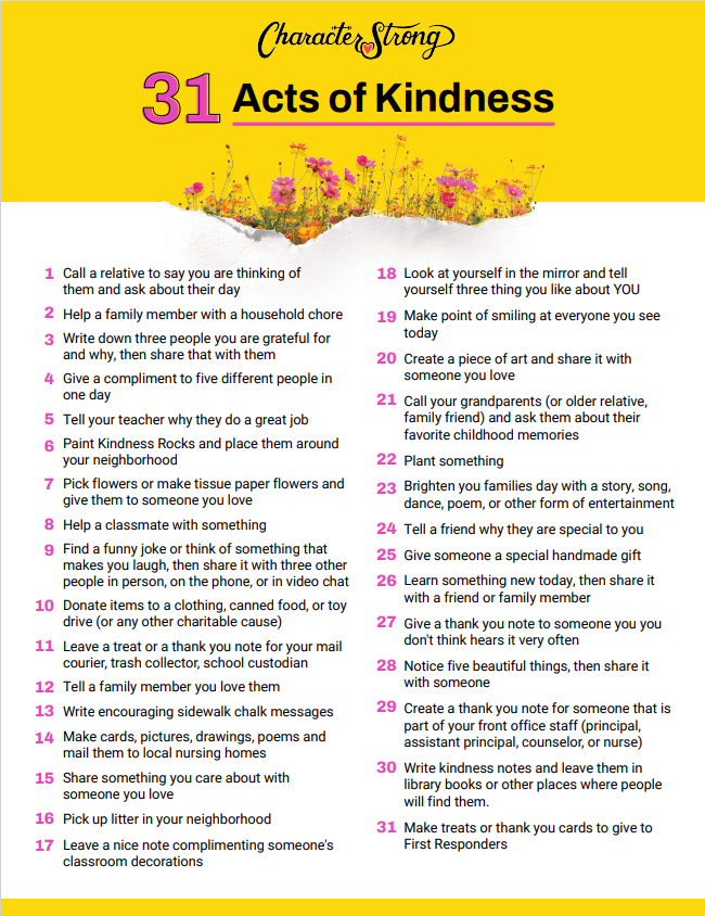 The planners behind World Kindess Day feel that kindness can inspire and create positive change by moving hearts and minds to bring about a kinder and more compassionate world. Attached is a form from Character Strong that has suggestions for 31 ways to show kindness. It would be great to encourage your child to take a look at the list and see if there are any acts of kindness they would be able to perform for a friend, grandparent, or a random stranger, maybe something you can do together such as make cards, pictures, drawings or write poems and deliver to a nursing home. Talk to an older relative and ask them to tell you about a special memory they have from growing up, or paint Kindness Rocks and place them around your neighborhood.