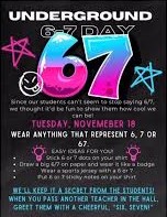 To celebrate the 67th day of school, teachers and staff participated in "Underground 67 Day"! We wore shirts involving the numbers "6" and "7" while students were kept in the dark until they caught on, boosting morale and creating fun inside jokes. It was hilarious to see students' faces as the adults passed each other in the hallways with the ever-infamous "SIX-SEVENNNNN"! |